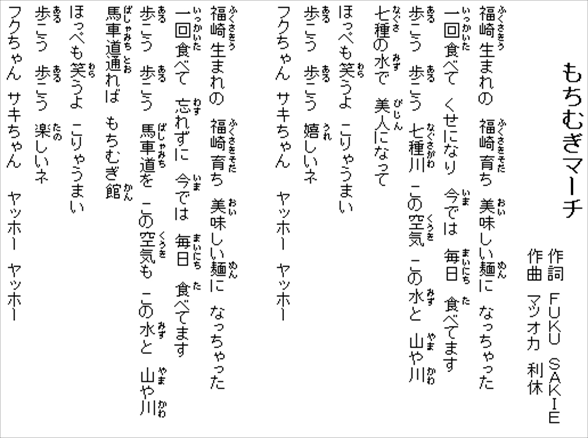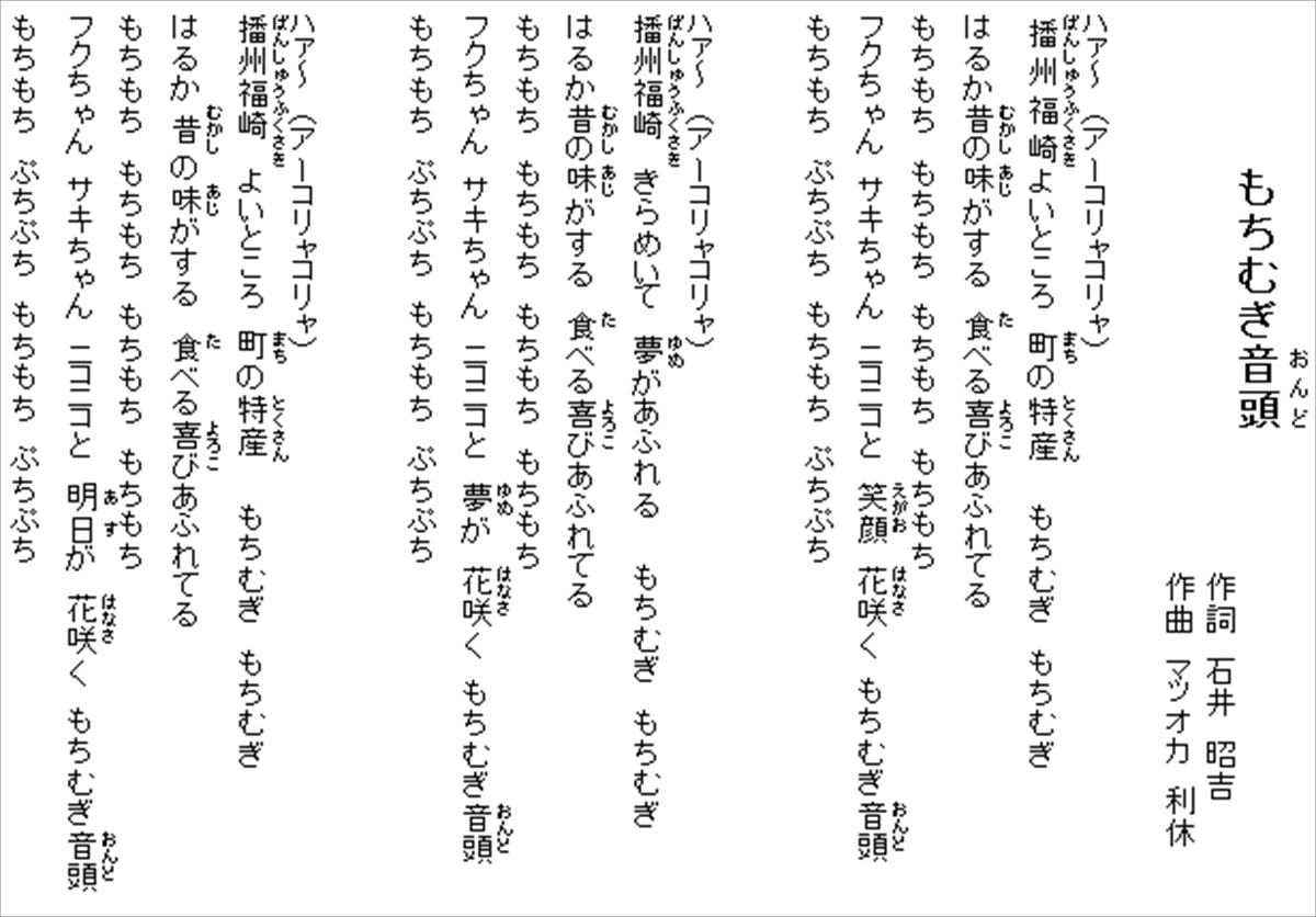 「もちむぎマーチ」は、応募総数29曲の中から優秀賞に選ばれた曲です。歌詞は福崎町在住のFUKU SAKIEさんが手がけ、福崎町辻川出身の作曲家・マツオカ利休さんが軽やかなメロディーを加えました。