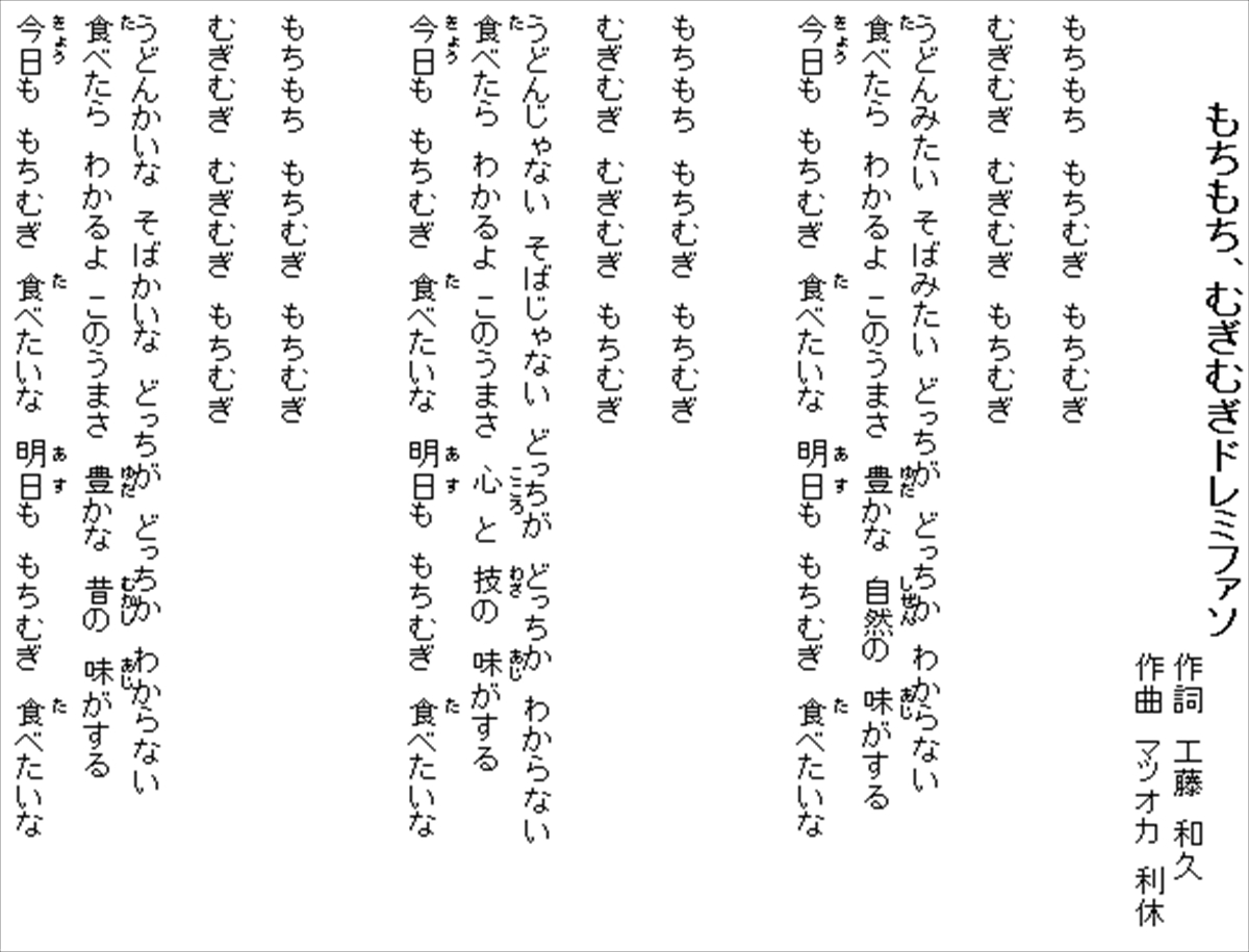 「もちもち、むぎむぎドレミファソ」は、佳作に選ばれた作品の一つで、青森県弘前市在住の工藤和久さんによる歌詞に、マツオカ利休さんが作曲を手がけました。
